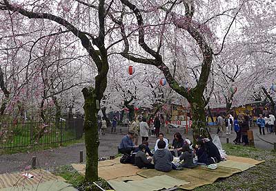 在櫻花盛開的季節,一家大小在坐墊上賞櫻和野餐的情景隨處可見。