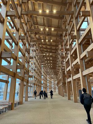 「夢洲」原本是工業廢料堆積區,如今卻被賦予了「未來城市實驗室」的使命。 大屋根:融合傳統與未來的巨型生態膜場館核心「大屋根」(Grand Roof)是建築師藤本壯介的生涯代表作。這座長達2公里、高20公尺的木構穹頂,以江戶時代「組子細工」木格柵為靈感,由30萬片國產杉木板交織而成。「大屋根」也是現今世上最大的木結構。 穹頂的設計暗藏玄機: