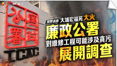- 廉政公署成立專案小組,調查宏福苑大維修工程是否涉及貪污。2025年11月28日,廉政公署拘捕大維修工程顧問公司4人、棚架工程分判商3人和1名中間人,並到所屬辦公室和被捕人的住所搜證,晚上再拘捕曾被警方拘捕、但已獲釋的工程承辦商3人。12月17日,廉政公署拘捕現任宏福苑業主立案法團主席徐滿柑及前主席鄧國權。合共拘捕14人。