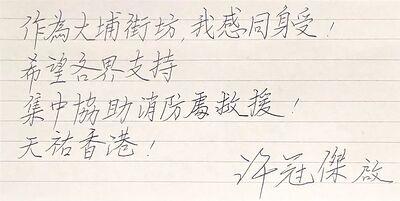 許冠傑寫下「天佑香港」為市民打氣。