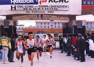 香港的馬拉松歷史可追溯至1992年,田徑總會舉辦第一屆「港深馬拉松」,有600多名來自10個國家的選手參加,由粉嶺運動場出發經落馬洲皇崗口岸過關,以深圳市體育館為終點,全程42.195公里,其中約8公里(5分之1路程)在香港跑。「港深馬拉松」成功舉辦過兩屆(1992年及1993年),後來因經費問題暫停舉辦。及至1997年2月16日,香港正值政權交替前夕,社會氣氛不明朗,渣打銀行為增添正能量,贊助了第一屆馬拉松賽事,過千人由香港出發經落馬洲皇崗口岸跑到深圳,寓意香港回歸,「渣打香港馬拉松」就此誕生。當時賽道由上水跨越落馬洲至深圳,故亦稱「渣打港深馬拉松」,共有逾1,000人參加。特點是在賽前一晚,所有運動員需聚集於灣仔運動場,由主辦機構收起他們的回鄉證交予過境部門認證,然後給他們發一個如「籌碼」般的牌仔,經過皇崗時扔下即可過關。