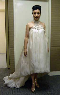 Liza當晚穿著夏姿贊助的雪白寬身拖尾長裙,以雍容華貴的姿態主持台慶亮燈儀式。