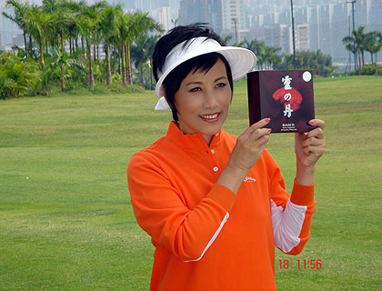 Liza穿上一身高爾夫球裝束,為「靈之丹」拍攝廣告。