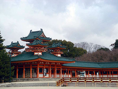 平安神宮乃1895年(明治28年)為紀念日本古都平安遷都1100周年,根據前平安京朝堂院建築縮小重建而成,用以祭奉桓武天皇和孝明天皇。整座神宮紅柱碧瓦,採用了左右對稱的建築格局。
