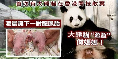 盈盈誕下首對香港出生熊貓2024年3月盈盈及樂樂在香港海洋公園成功自然交配,盈盈經過近五個月的孕育期,於2024年8月15日凌晨2時05分及3時27分誕下一對龍鳳胎,為第一對在香港出生的大熊貓。盈盈是在她19歲生日前一日成功做媽媽,是有紀錄以來全球最年長初次成功產子的大熊貓,而且是雙胞胎,案例非常罕見。新生的大熊貓姐弟分別重122克及112克,雙胞胎出生體重比正常體重低、體溫偏低,進食較少,出生時的叫聲亦比較弱,專家評估雙胞胎狀態「非常脆弱」。海洋公園表示兩隻大熊貓寶寶料數月後才與市民正式見面。 就此,香港海洋公園特意開設香港首個以熊貓為主題的社交網站,分享大熊貓近況。