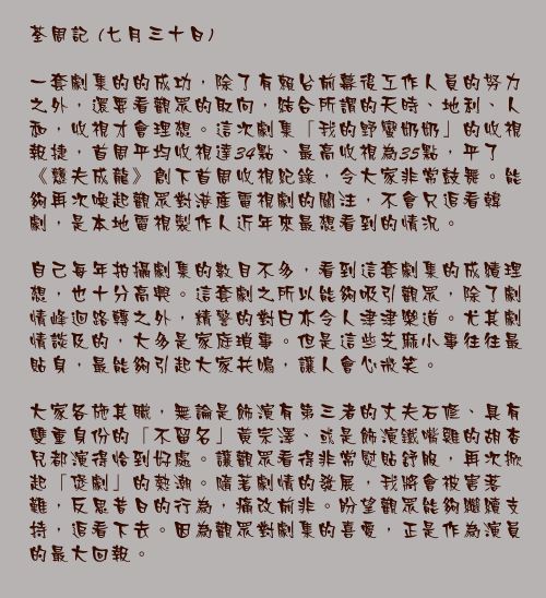 一套劇集的的成功,除了有賴台前幕後工作人員的努力之外,還要看觀眾的取向,結合所謂的天時、地利、人和,收視才會理想。這次劇集「我的野蠻奶奶」的收視報捷,首周平均收視達34點、最高收視為35點,平了《戇夫成龍》創下首周收視紀錄,令大家非常鼓舞。能夠再次喚起觀眾對港產電視劇的關注,不會只追看韓劇,是本地電視製作人近年來最想看到的情況。