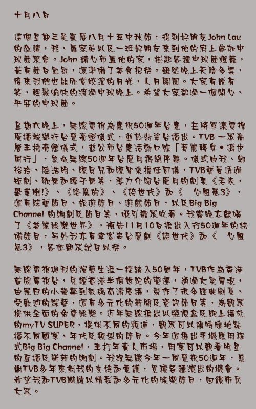 星期六晚上,無線電視為慶祝50週年台慶,在將軍澳電視廣播城舉行台慶亮燈儀式,並於翡翠台播出。TVB 一眾高層主持亮燈儀式,並公佈台慶活動口號「華麗轉身‧邁步同行」,象徵無線50週年台慶月揭開序幕。儀式由我、鄭裕玲、陸浩明、陳貝兒和陳智燊擔任司儀,TVB藝員透過短劇、歌舞和鏡子舞等,落力介紹台慶月的劇集《老表,畢業喇!》、《降魔的》、《誇世代》和《溏心風暴3》,還有綜藝節目、旅遊節目、遊戲節目,以及Big Big Channel 的網劇及節目等,吸引觀眾收看。我當晚亦獻唱了《美麗娛樂世界》,預告11月10日推出入行50週年的特備節目,另外我亦有幸客串台慶劇《誇世代》和《溏心風暴3》,各位觀眾拭目以待。