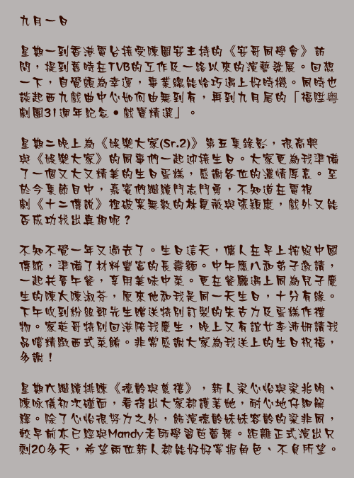 星期一到香港電台接受陳圖安主持的《安哥同學會》訪問,提到舊時在TVB的工作及一路以來的演藝發展。回想一下,自覺頗為幸運,事業總能恰巧遇上好時機。同時也談起西九戲曲中心如何由無到有,再到九月尾的「福陞粤劇團31週年紀念•戲寶精選」。